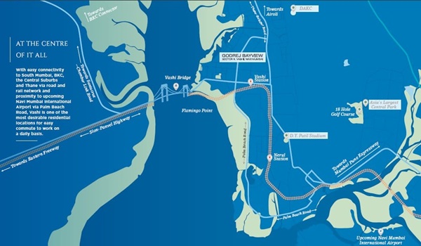 Godrej Bayview is strategically located near Croma - Vashi Akshar Plaza, Sector 9, Vashi, Mumbai. Vashi is a luxury locality situated in Navi Mumbai. The locality is connected to major parts of the city via Vashi railway station. Further, Vashi, Nerul L.P, Sanpada railway station, Turbhe railway station enhance its connectivity.